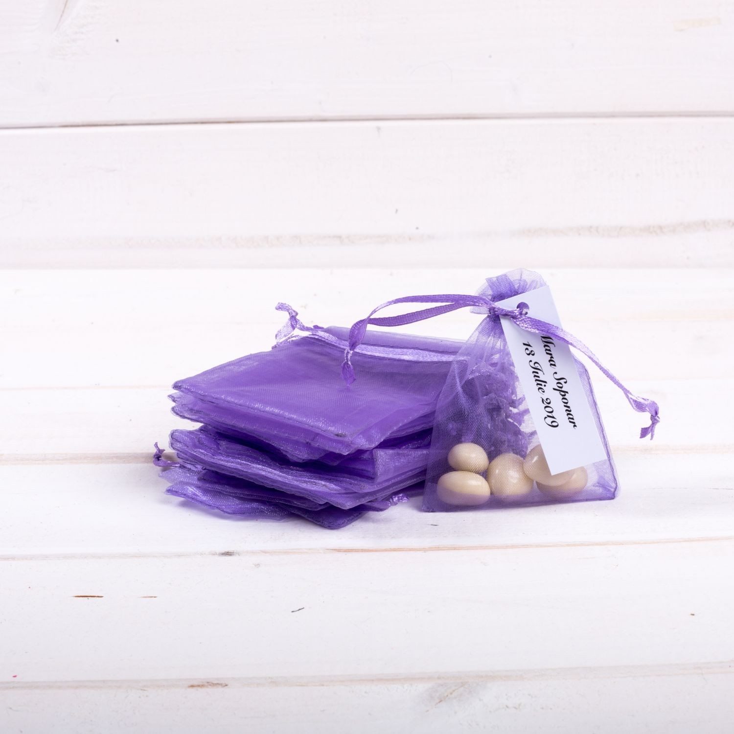 Saculetii din organza lila, cu snur in capat sunt niste marturii botez care se ofera invitatilor prezenti la restaurant umpluti cu bomboane colorate sau cu alte mici accesorii (iconite, margele, bomboane etc).