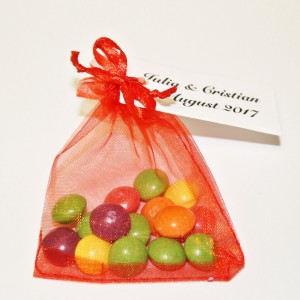 Saculetii din organza se leaga la capat cu un snur dupa ce sunt umpluti cu bomboane sau cu mici obiecte. Bomboanele din imagine sunt cu titlu informativ si nu sunt incluse in pret. Nu comercializam bomboane.