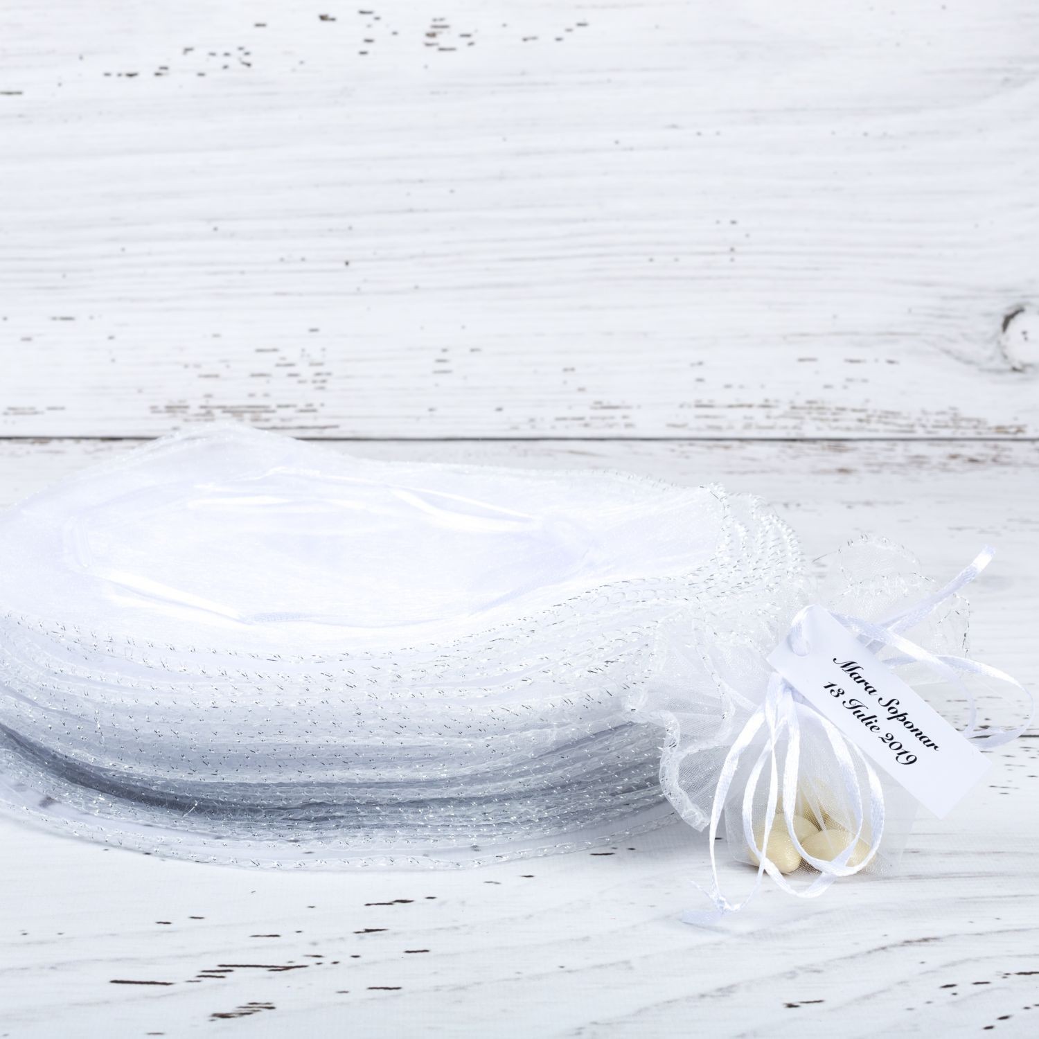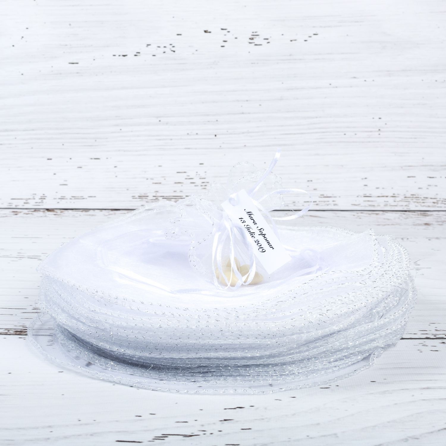 Acestia sunt realizati din organza si se leaga cu fundita din saten alb dupa ce i-ai umplut cu mici margele, bomboane, pietricele sau alte accesorii dragute.