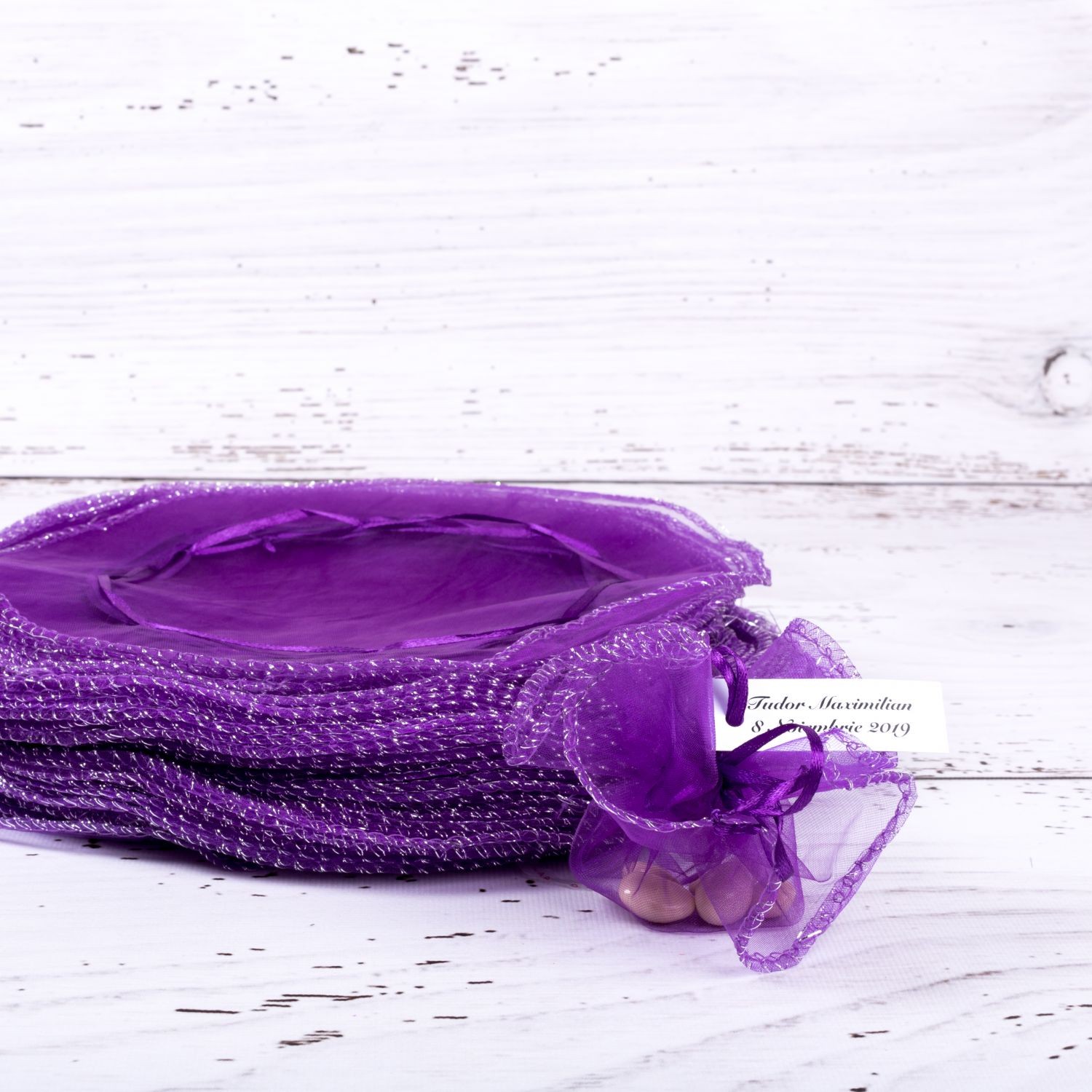 Saculetii din organza se asigura cu un snur satinat in aceeasi culoare cu saculetul. Marturiile de culoare mov sunt perfecte pentru botezul unei fetite care poarta o rochita in aceasta culoare placuta si accesorizata cu fir irizant de culoare argintie.