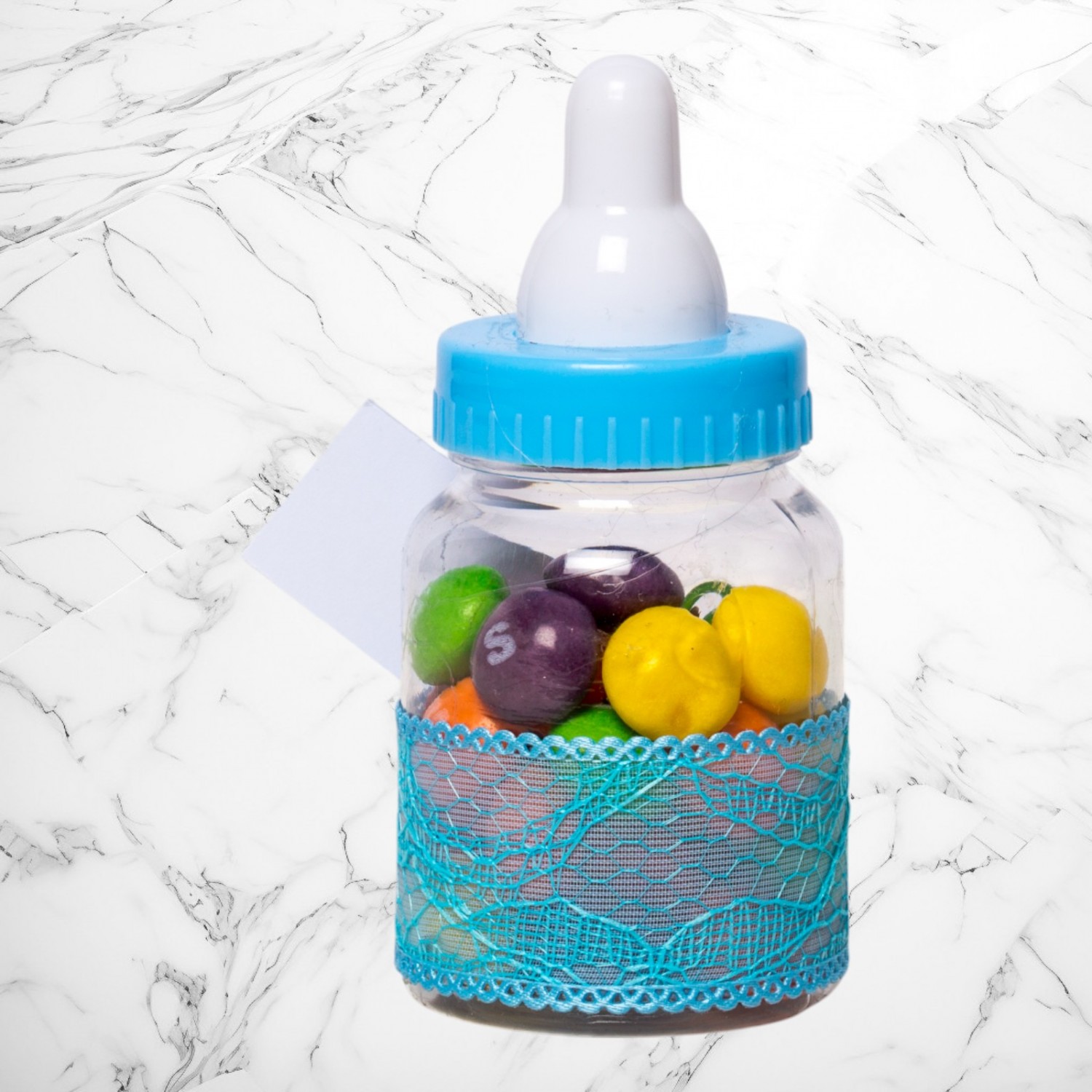 Transformă botezul băiețelului tău într-un eveniment memorabil cu aceste mărturii sub formă de biberon bleu, perfecte pentru a mulțumi invitaților. Realizate din plastic transparent și decorate manual, aceste suveniruri elegante adaugă un plus de rafinament evenimentului tău.