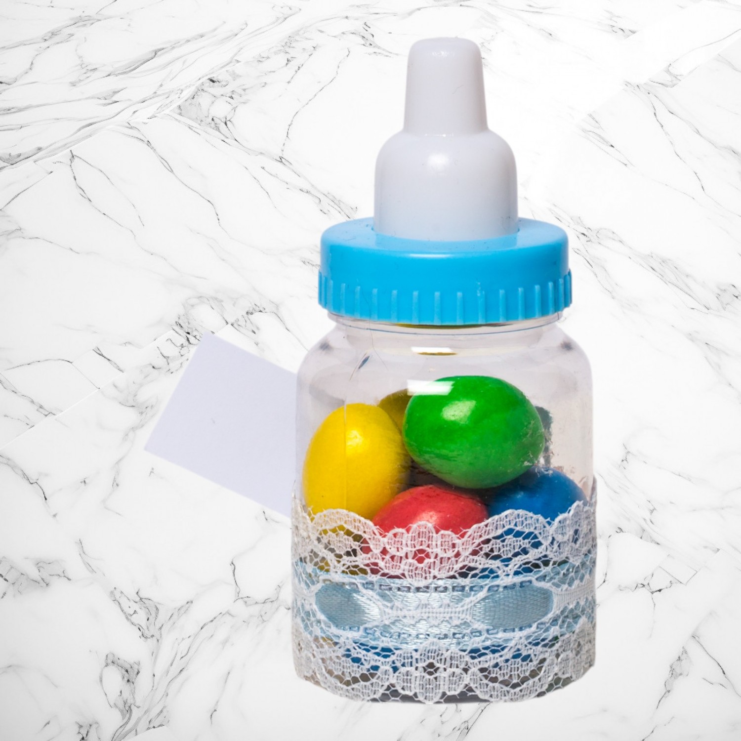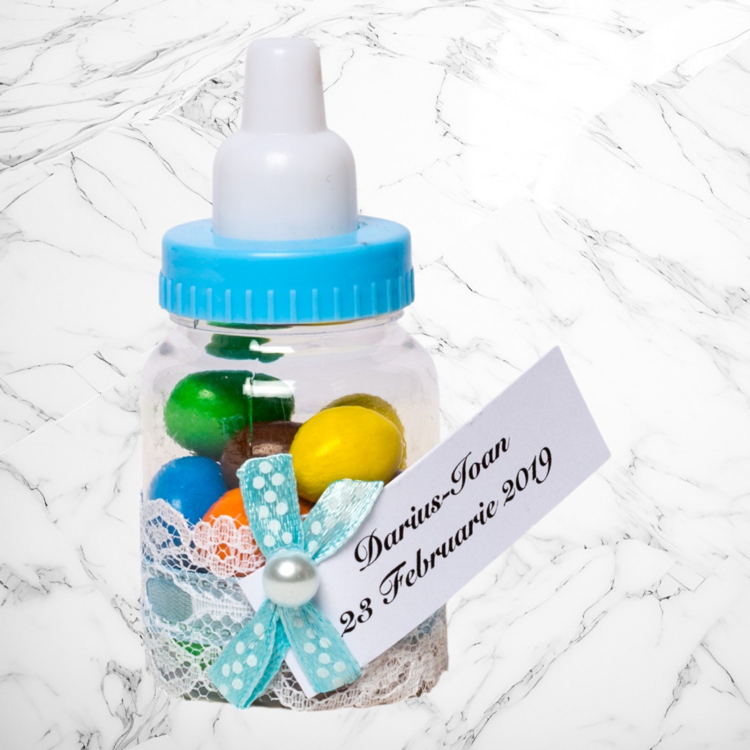 Marturii botez biberoane bleu dantela alba si fundita asortata cu buline