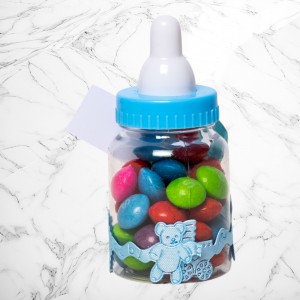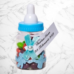 Transformă botezul băiețelului tău într-un eveniment memorabil cu aceste mărturii sub formă de biberon bleu, perfecte pentru a mulțumi invitaților. Realizate din plastic transparent și decorate manual, aceste suveniruri elegante adaugă un plus de rafinament evenimentului tău.