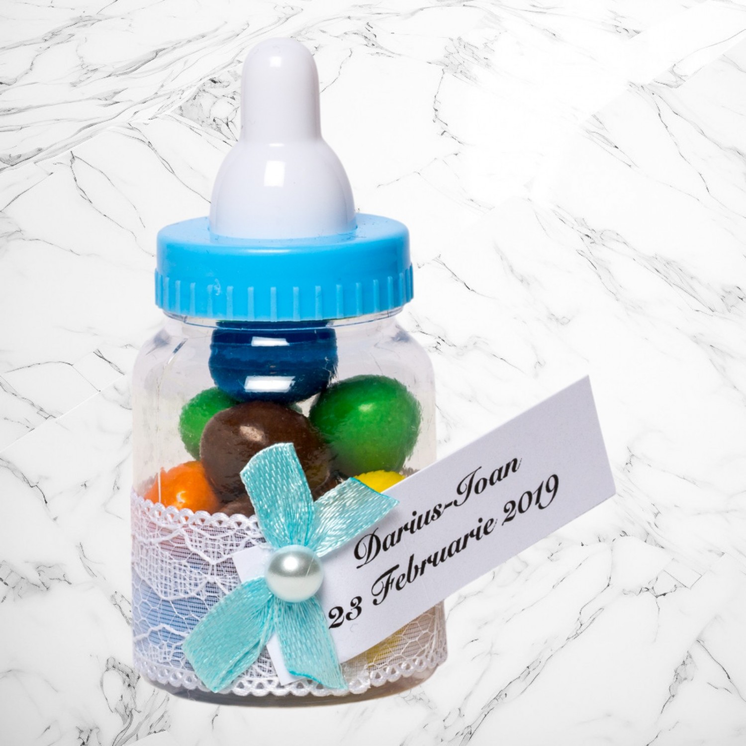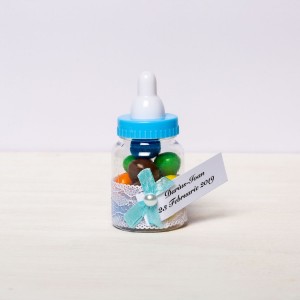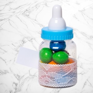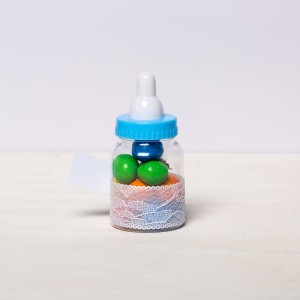 Transformă botezul băiețelului tău într-un eveniment memorabil cu aceste mărturii sub formă de biberon bleu, perfecte pentru a mulțumi invitaților. Realizate din plastic transparent și decorate manual, aceste suveniruri elegante adaugă un plus de rafinament evenimentului tău.