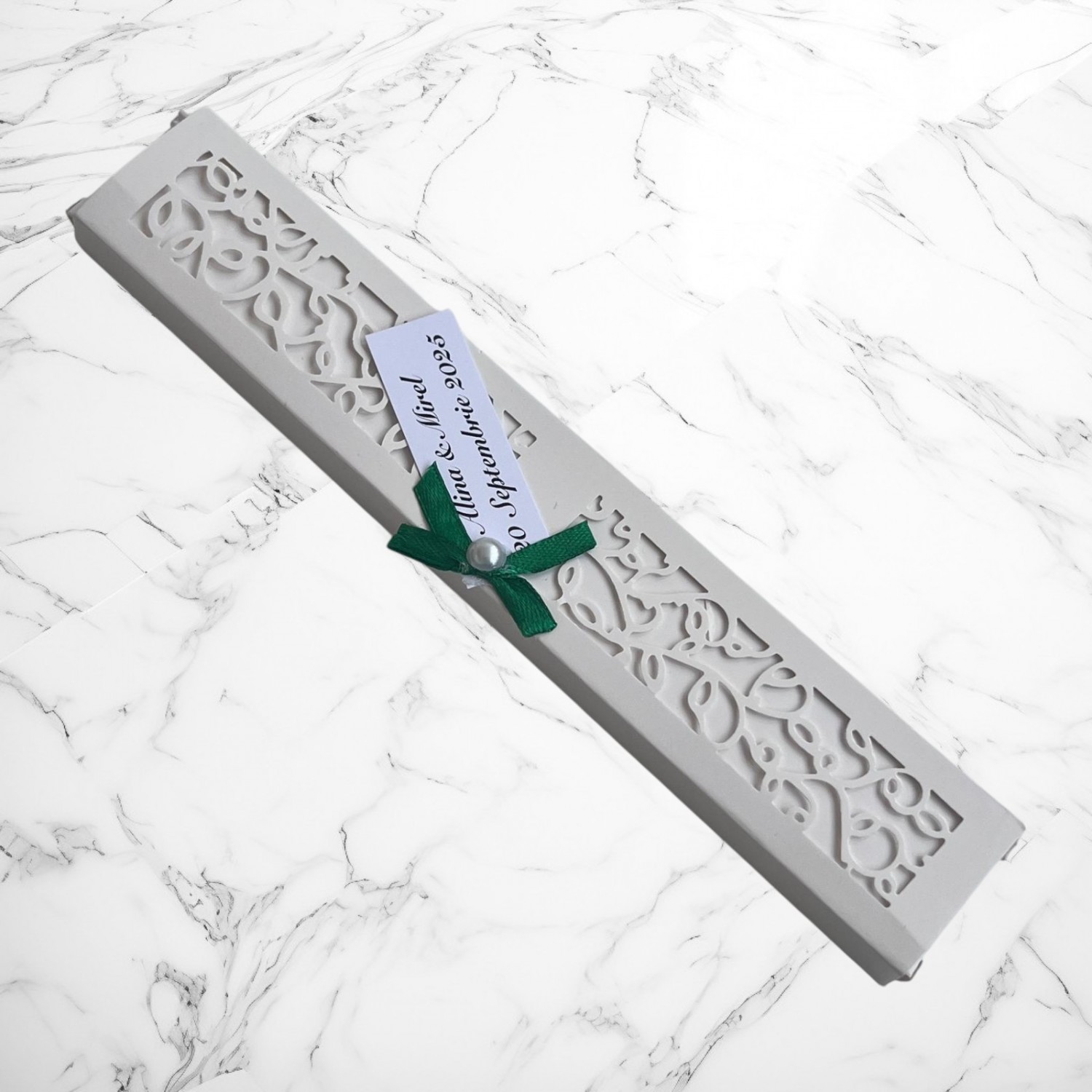 Ambalaj: cutie cu decupaje elegante și fundiță cu perlă + etichetă personalizabilă