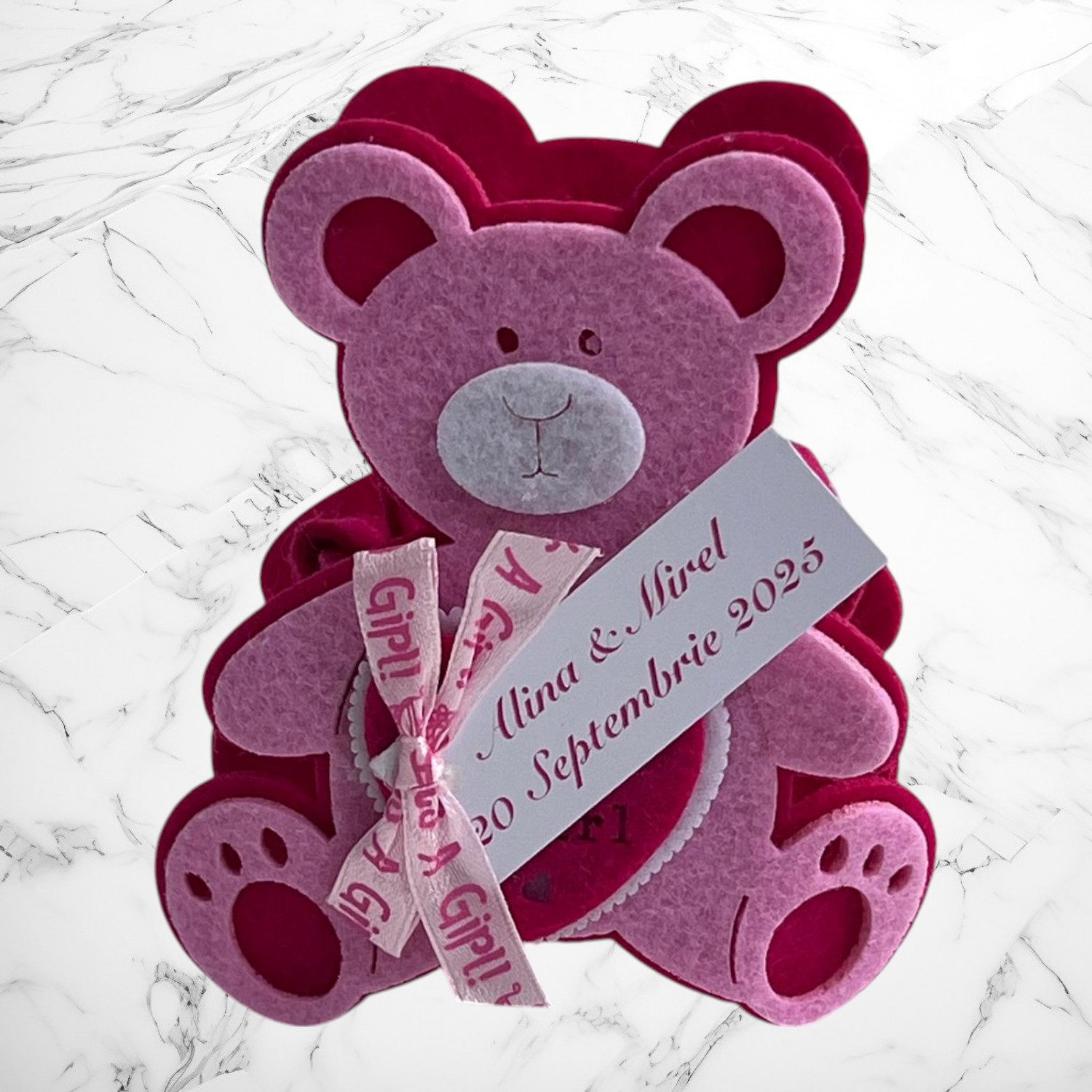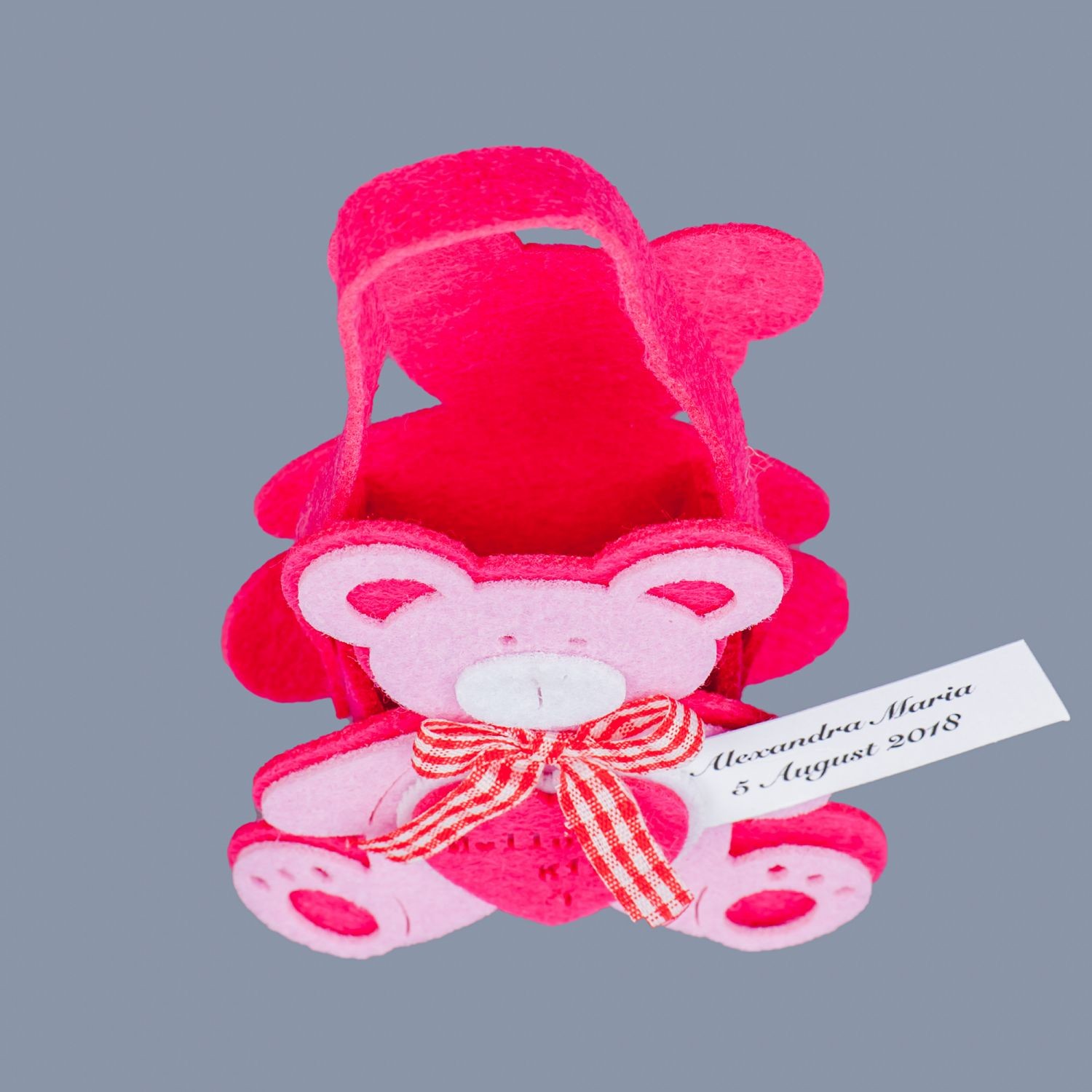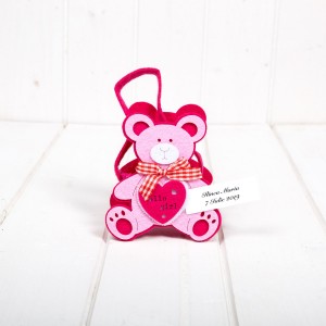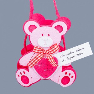 In cosulete poti pune cateva bomboane sau arahide asezate in saculeti din organza. Unul dintre ursuleti are o fundita la gat, de care se poate prinde o eticheta cu numele fetitei si data evenimentului.