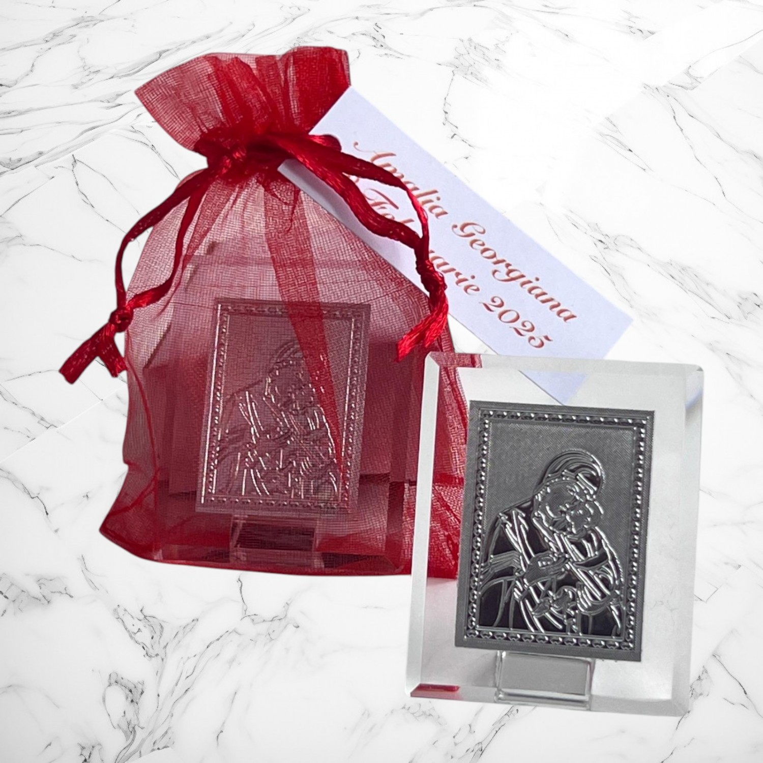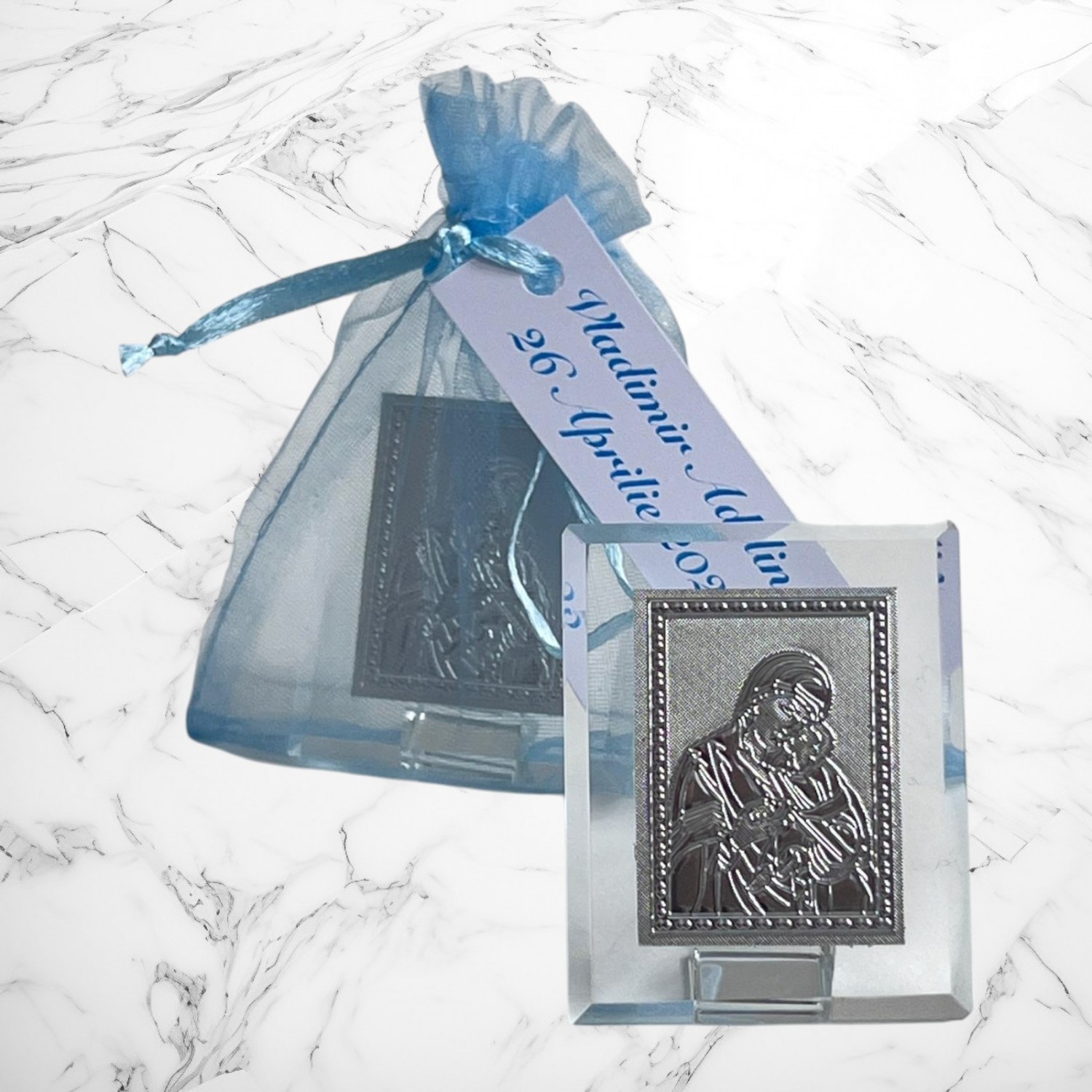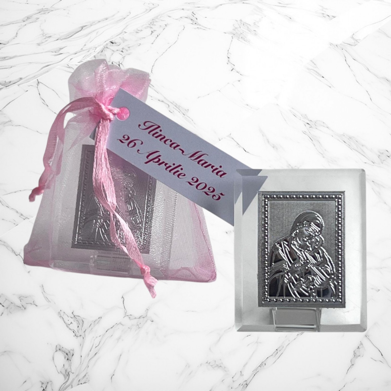 Iconitele se ofera in saculeti din organza, cu eticheta pe care se trece numele copilului si data nasterii. Saculetul si eticheta sunt gratuite.
