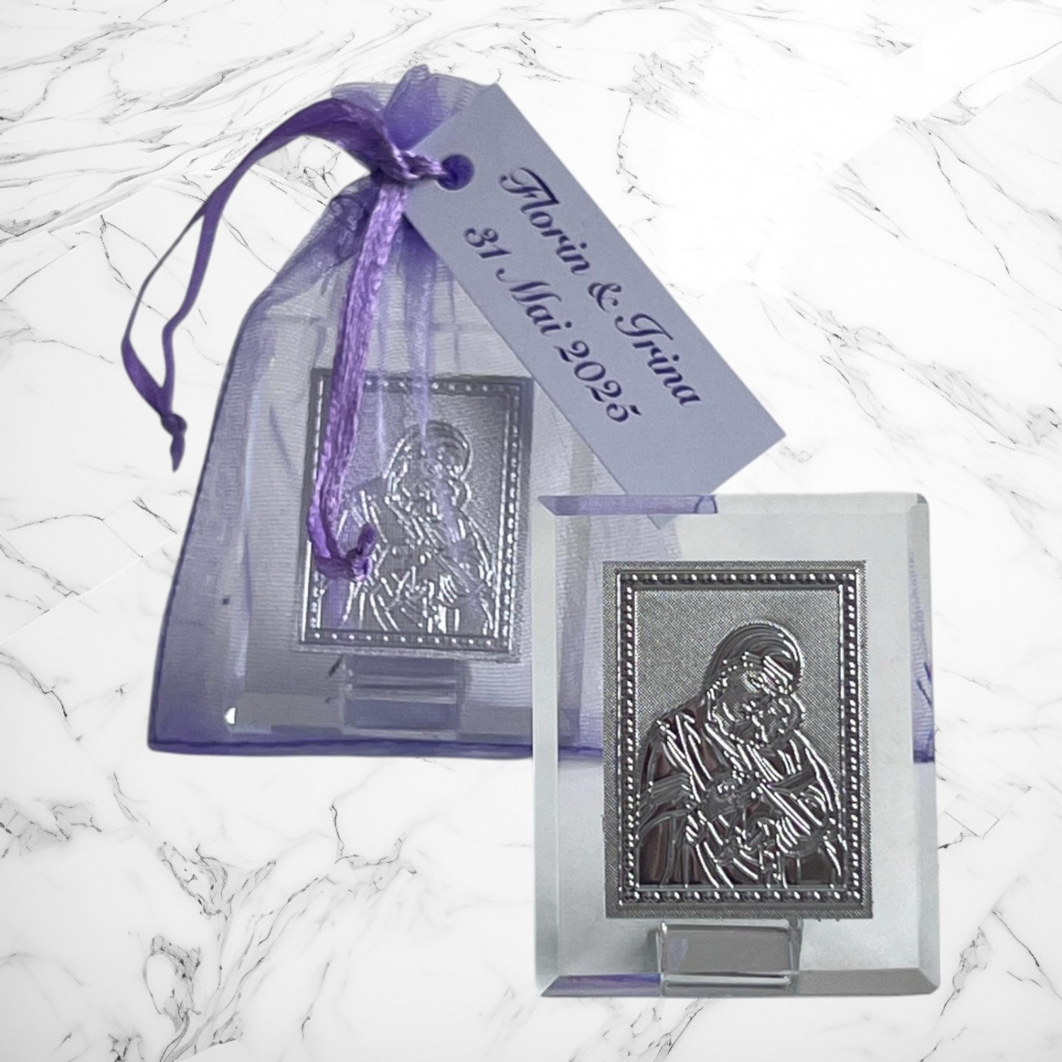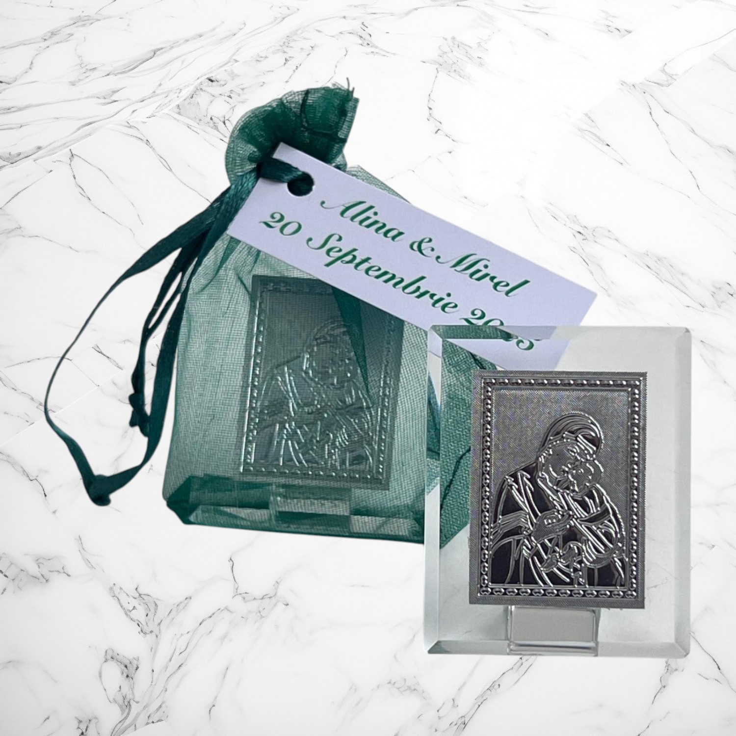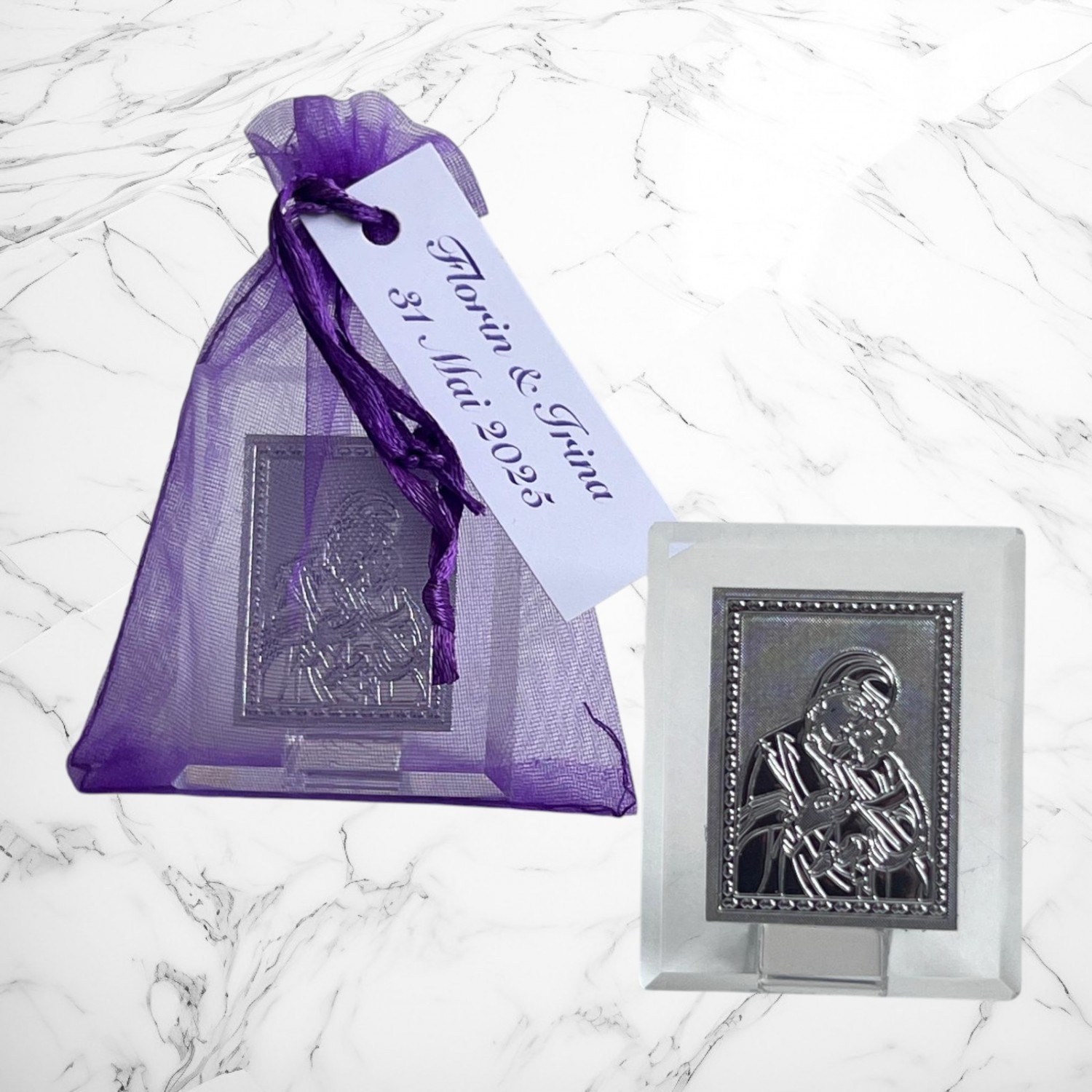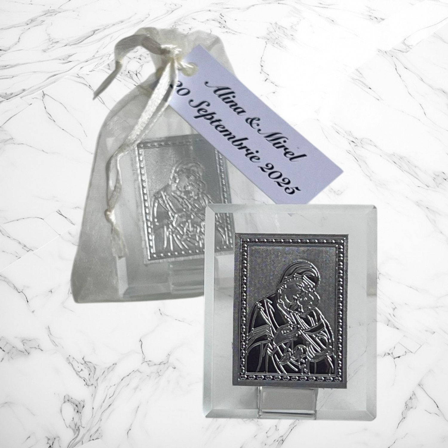 Iconitele se ofera in saculeti din organza, cu eticheta pe care se trece numele copilului si data nasterii. Saculetul si eticheta sunt gratuite.