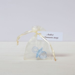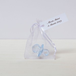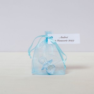 Suzetele sunt nelipsite din viata unui sugar si reprezinta o amintire draguta de la prima petrecere importanta din viata oricarui baietel. Marturiile se ofera in saculeti de organza, cu eticheta atasata.