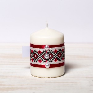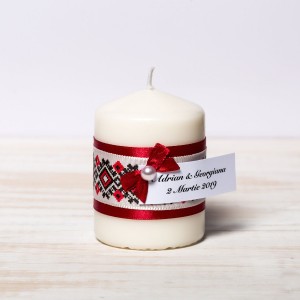 De lumanare este lipita o banda satinata de culoare bordo, o banda cu model popular in nuante de rosu si negru pe fond alb, o fundita din satin bordo cu jumatate de perla in mijloc si trei perlute la spate, asezate una sub alta.