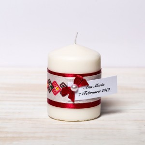 Mirii care vor sa lase o impresie de durata asupra invitatilor la nunta, le pot oferi acestora in cadrul unui eveniment cu tema rustica marturii lumanari nunta cu banda bordo, fundita in aceeasi culoare, patru perlute albe si motive traditionale.
