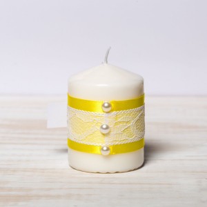 Marturiile de nunta lumanari cu decor manual format din banda din satin galben, dantela alba, fundita galbena si patru perlute albe sunt alegerea perfecta pentru evenimentele programate in sezonul cald.