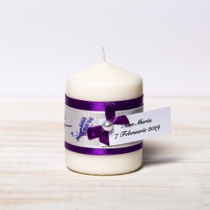 Pentru o nunta regala cu tema Lavanda, mirii isi pot recompensa invitatii in semn de multumire pentru prezenta lor la eveniment cu marturii lumanari nunta decorate festiv cu banda si fundita mov, model lavanda si perlute.