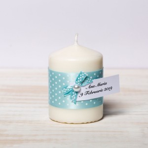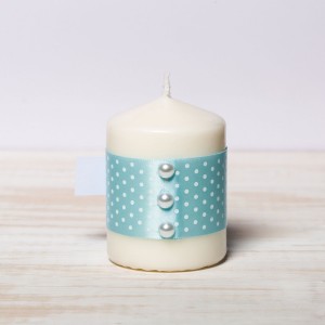 Mirii care si-au pus in gand sa aiba parte la nunta de buna dispozitie si un decor alb-bleu cu elemente jucause, pot oferi invitatilor ca si marturii niste lumanari decorate manual cu banda bleu cu buline albe, fundita asortata si patru jumatati de perluta albe.