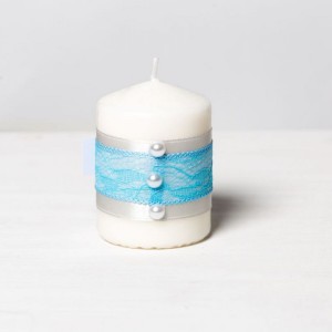 Pentru un eveniment care are in centru obiecte decorative in alb (puritate) si bleu (seninatate), lumanarile decorate festiv cu banda din satin argintiu, dantela bleu si fundita alba cu perlute asortate sunt perfecte pentru o nunta in stil clasic.