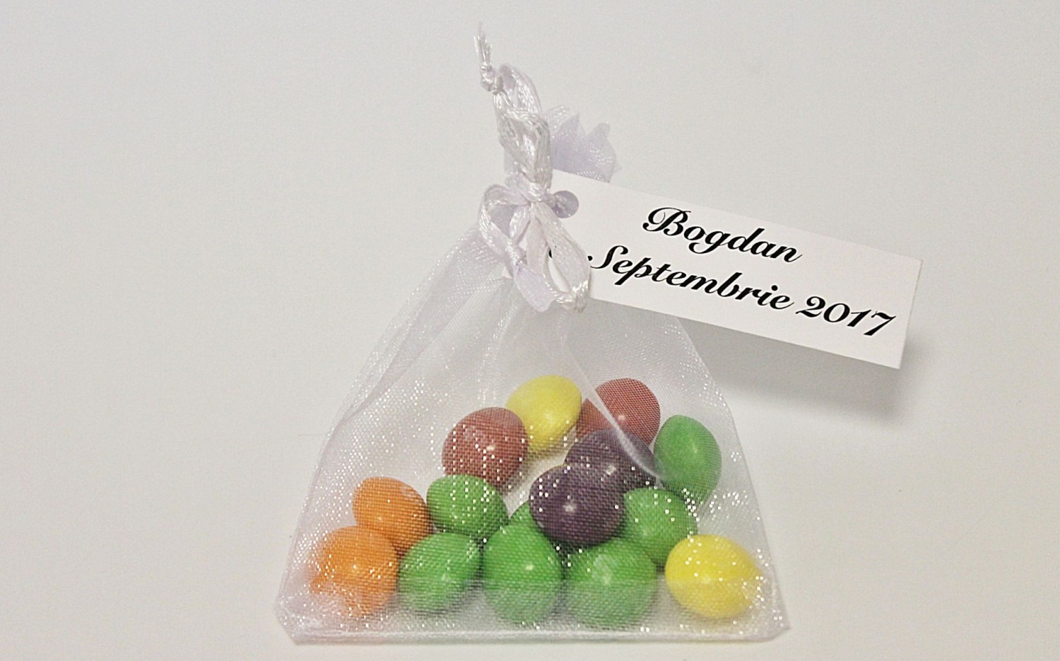 Saculetii se pot eticheta. Pe cartonas se noteaza numele mirilor si data evenimentului.