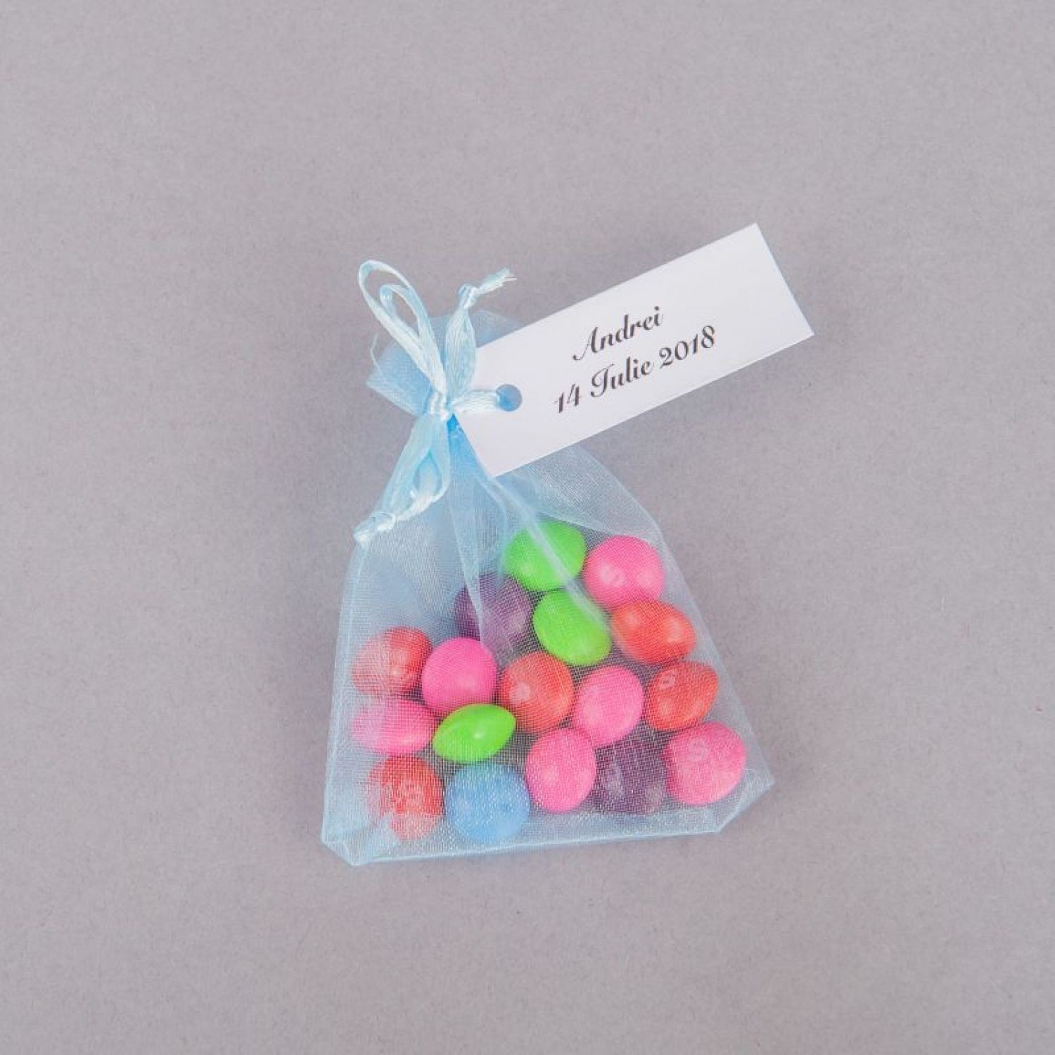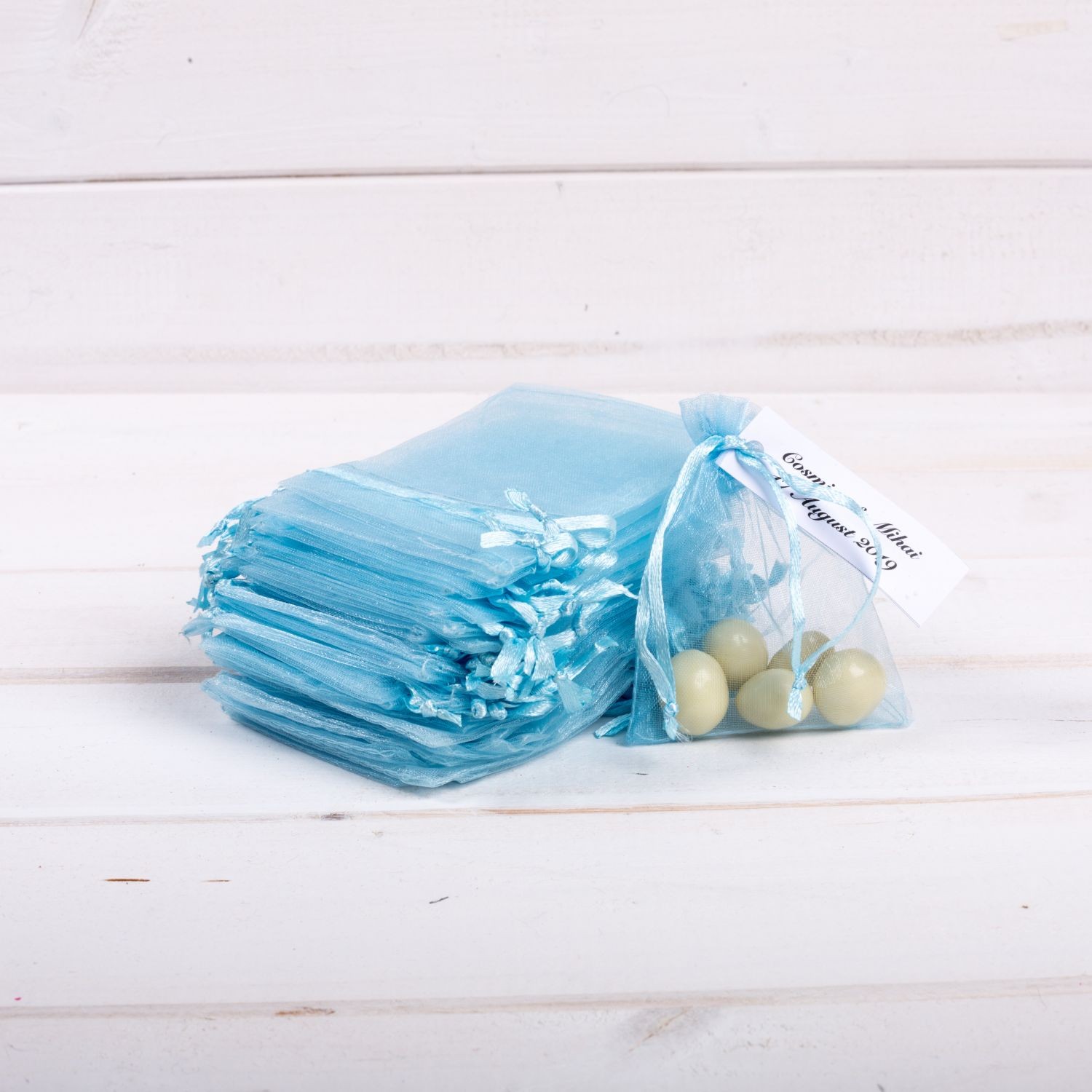 Ofera-le invitatilor prezenti la eveniment saculeti organza bleu in cadrul unei nunti cu buget restrans. Acestia se ofera umpluti cu bomboane colorate sau alte mici accesorii dragute (rame foto, accesorii sticla, semne de carte).