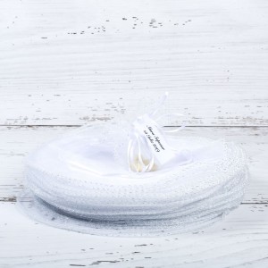 Marturiile saculeti din organza cu forma rotunda si margine tivita cu fir argintiu sunt alegerea potrivita pentru o nunta eleganta, cu tematica "Alba ca zapada".