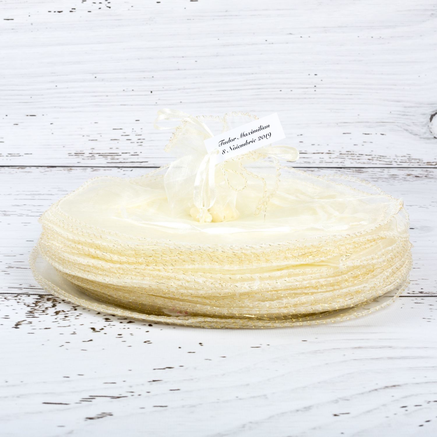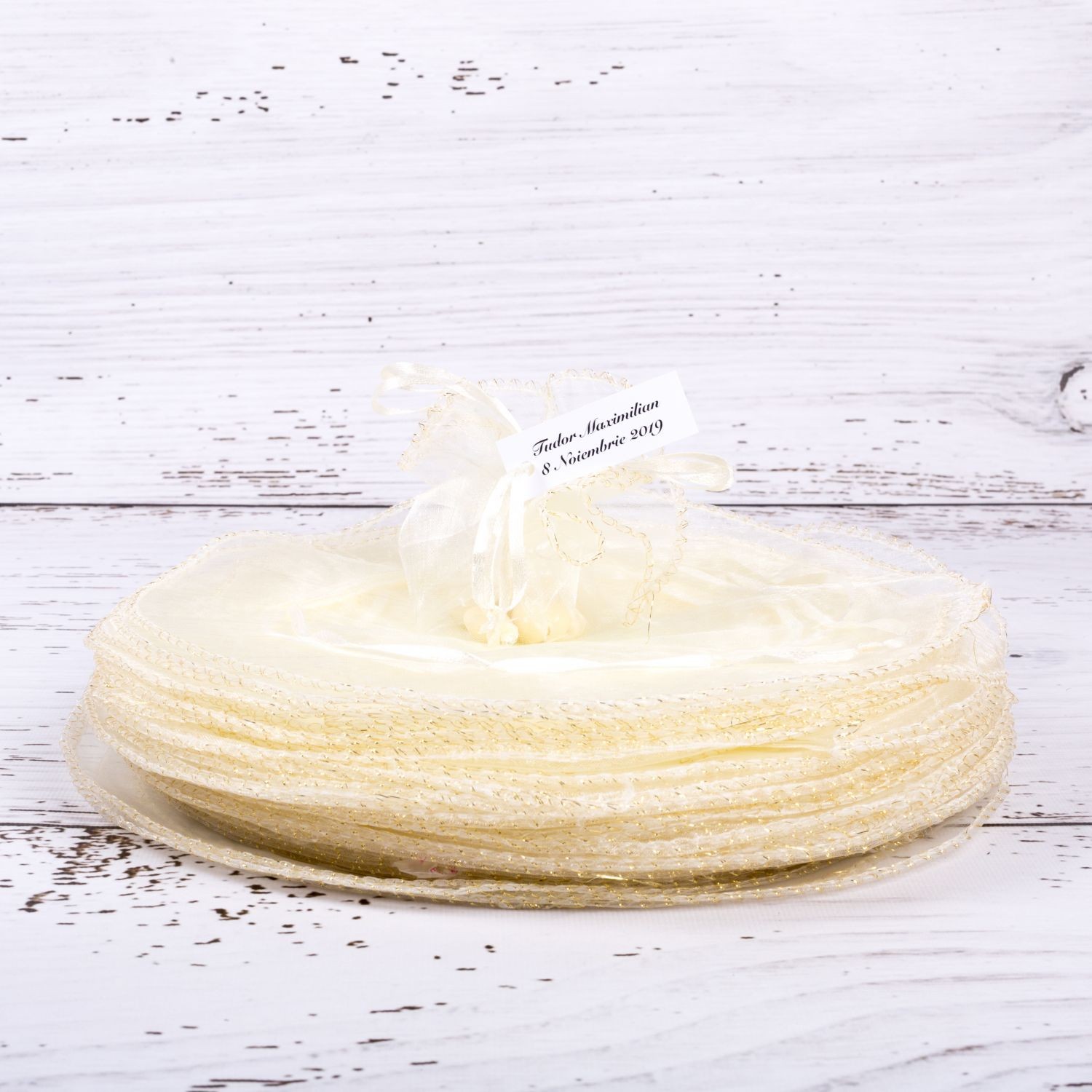 Marturiile botez saculeti ivory cu fir argintiu sunt o buna alegere pentru orice tip de nunta de la rustic la vintage. Aceste mici cadouri pentru invitati se ofera cu bomboane, arahide glazurate, margelute tio perla sau alte accesorii dragute.