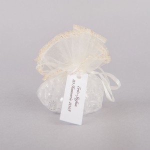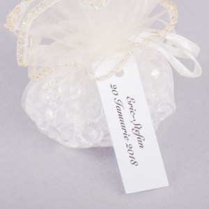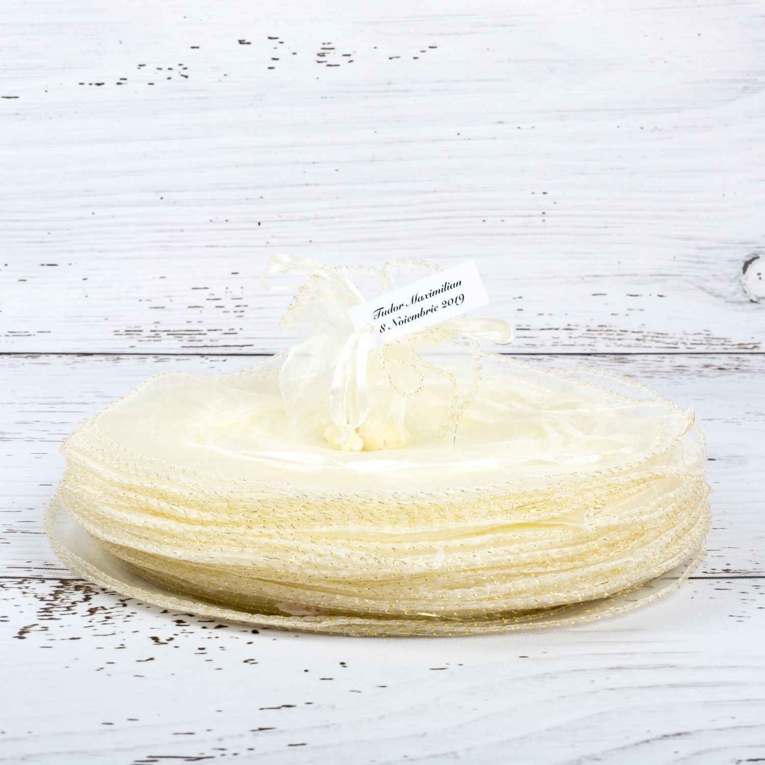 Invitatii vor folosi cu siguranta saculetii dupa nunta pentru a-si pastra in ei micile bijuterii. Acestia se leaga cu un snur decorat pe margini cu fir auriu. Optional, saculetii pot fi personalizati cu eticheta pe care se trece numele mirilor si data evenimentului.