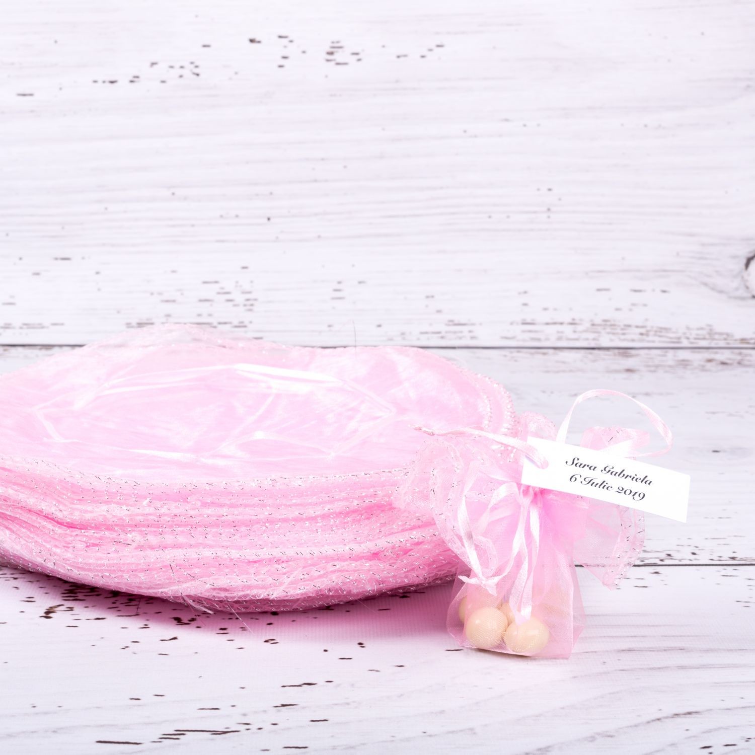 Optional, saculetii se personalizeaza cu eticheta pe care se trece numele mirilor si data evenimentului.