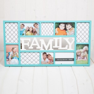 Rama foto cu cadru bleu are pe mijloc cuvantul Family, scris cu majuscule albe. Se poate pastra pe birou sau pe perete. Aceasta are suport de sprijin.