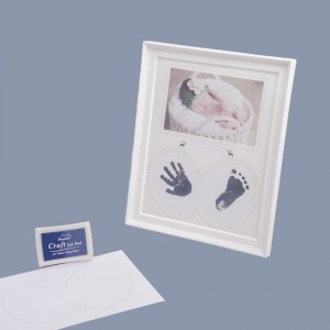 Aceasta fotografie cu amprentele bebelusului este o amintire de durata. Cerneala poate fi folosita pentru tesaturi, lemn si hartie.