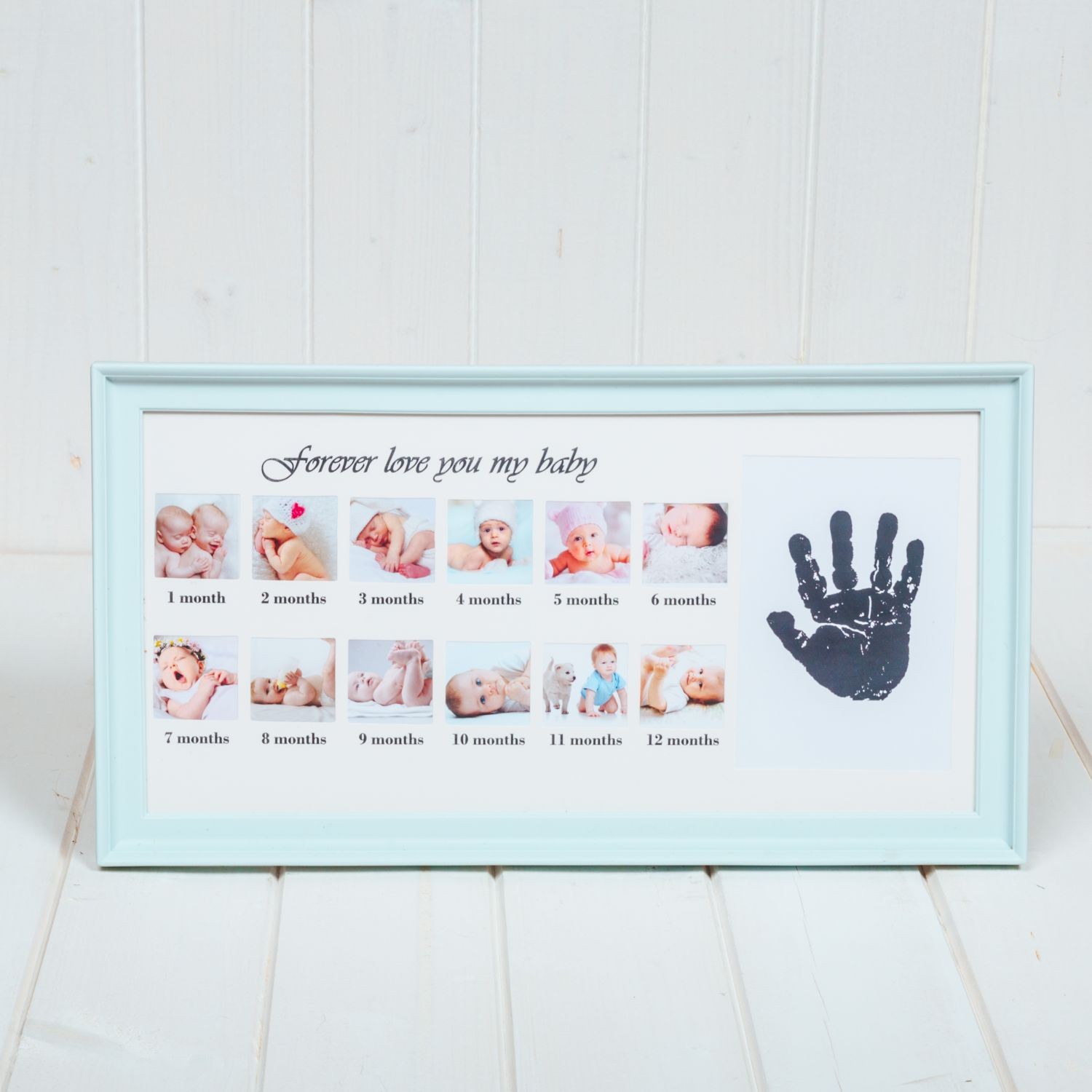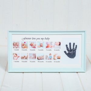 Rama foto bleu cu amprenta palma si spatiu prevazut pentru 12 fotografii este cadoul perfect pentru bebelusii care isi aniverseaza primul an de viata.