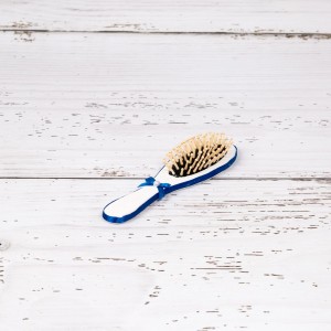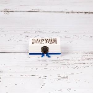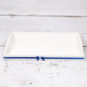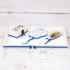Acest set elegant este format dintr-o tavita in care se pastreaza alte trei obiecte din set: cutie de verighete, pieptan si perie de par, realizate din lemn si decorate cu banda albastra si fundita asortata cu perluta in mijloc.