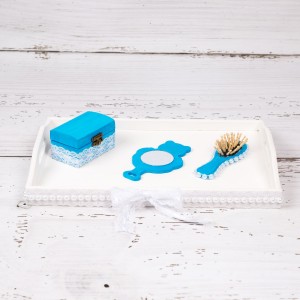 Accesoriile din set sunt decorate manual. Dupa ce nasa va taia motul baietelului, parintii acestuia vor pastra parul in cutiuta pentru prima suvita ca amintire.