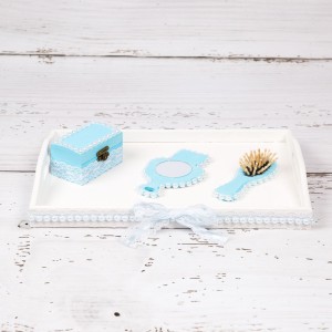 Pentru petrecerea de mot de la un an, parintii unui baietel cu ochi albastri pot alege un set mot care contine cateva accesorii importante: tavita, o cutiuta prima suvita tip cufar si o oglinda.