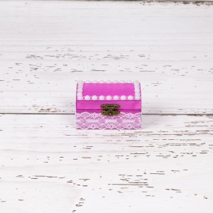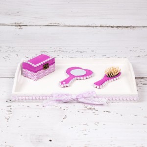 Cele patru accesorii din set set sunt realizate din lemn. Acestea sunt vopsite si decorate manual in nuante de alb pentru tavita si lavanda pentru restul accesoriilor: cutiuta mot, oglinda si perie de par. Siragul de perlute si dantela adauga o nota de eleganta articolelor din set.