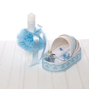 Lumanarea este realizata din ceara si decorata manual cu tulle si panglici bleu si text scris de mana (”Cu mult drag de la nasi/ Azi m-am crestinat”). Aceasta masoara 35 cm inaltime si are diametru de 5 cm.