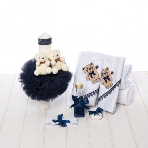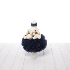 Pentru un botez in nuante de bleumarin cu tema ”Mos Martin”, nasii unui baietel pot alege doua accesorii esentiale pentru biserica si anume: o lumanare botez cu tulle bleumarin si doi ursuleti de plus si un trusou biserica cu model ursuleti.