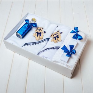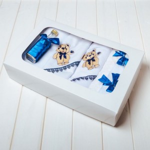 - Prosop cu capison pentru bebelus, folosit pentru scoaterea copilasului din cristelnita, imediat dupa botez. Prosopul are un ursulet pe capison cu o banda lata din dantela bleumarin la baza triunghiului. Dimensiuni: 78x74 cm.