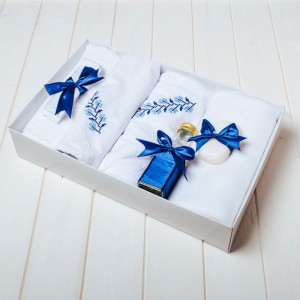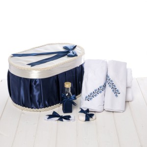 Pentru primul eveniment important din viata unui bebelus, parintii spirituali ai unui baietel pot cumpara un set biserica format din cutie trusou ovala de culoare bleumarin, cu funda pe capac si trusou cu model traditional.