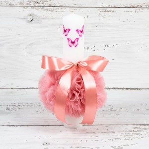 Lumanarea botez cu fluturi pictati si tulle roz pudra poate fi folosita la botezul unei fetite alaturi de un trusou in landou cu model similar. Inaltime: 35 cm. Diametru: 5,5 cm.