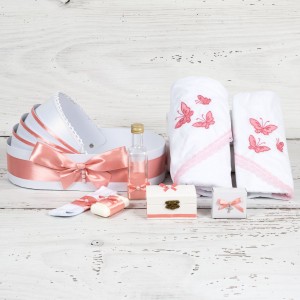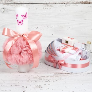 Acest set botez compus din lumanare si trusou botez cu fluturi si decor roz pudra este ideal pentru primul eveniment important din viata unei fetite si anume crestinarea.