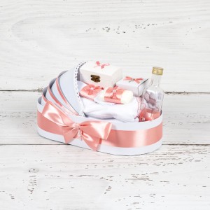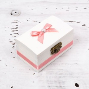 - cutiuta in forma de cufar pentru prima suvita. Micul cufar din lemn este decorat cu vopsea inofensiva pentru sanatate, data cu lac si decorata manual cu fundita si banda roz prafuit. Dimensiuni cutie mot/turta: 9 cm x 5,5 cm x 5 cm (L x l x H).