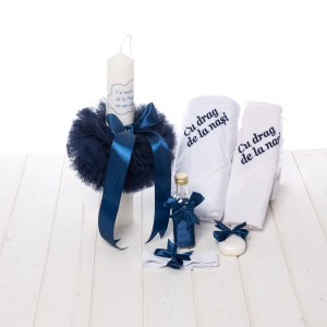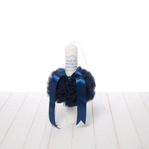 Lumanarea este realizata din ceara si decorata manual cu tulle si panglici bleumarin si text scris de mana (”Cu mult drag de la nasi/ Azi m-am crestinat”). Inaltime: 35 cm, Diametru: 5 cm.