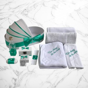 📦 Ambalaj: Toate elementele trusoului sunt așezate într-o cutie albă din carton, în formă de landou, decorată cu fundă și perlute