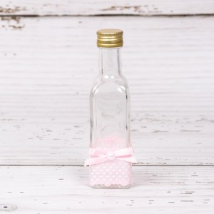 Pentru o fetita, nasii micutei ar putea sa aleaga sticluta de mir cu decor banda roz cu buline si fundita asortata cu perluta in mijloc, in timp ce parintii au datoria sa vina la biserica cu ulei si vin, pentru taina mirungerii, respectiv taina impartasaniei.