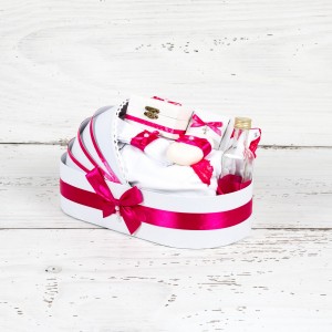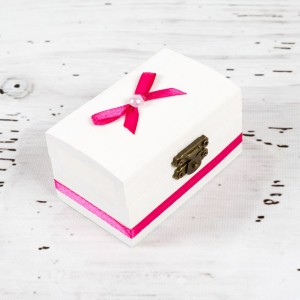- cutiuta in forma de cufar pentru prima suvita. Micul cufar din lemn este decorat cu vopsea inofensiva pentru sanatate, data cu lac si decorata manual cu fundita si banda roz fucsia. Dimensiuni cutie mot/turta: 9 cm x 5,5 cm x 5 cm (L x l x H).
