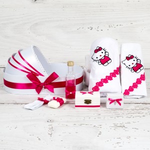 Pisicuta Hello Kitty este indragita de multi copii din zilele noastre, motiv pentru care parintii unei fetite pot folosi la botezul fiicei lor un set biserica compus din lumanare cu tulle roz fucsia si trusou in landou cu model brodat Hello Kitty pe panza de mir si prosopul bebelusului.