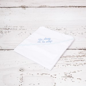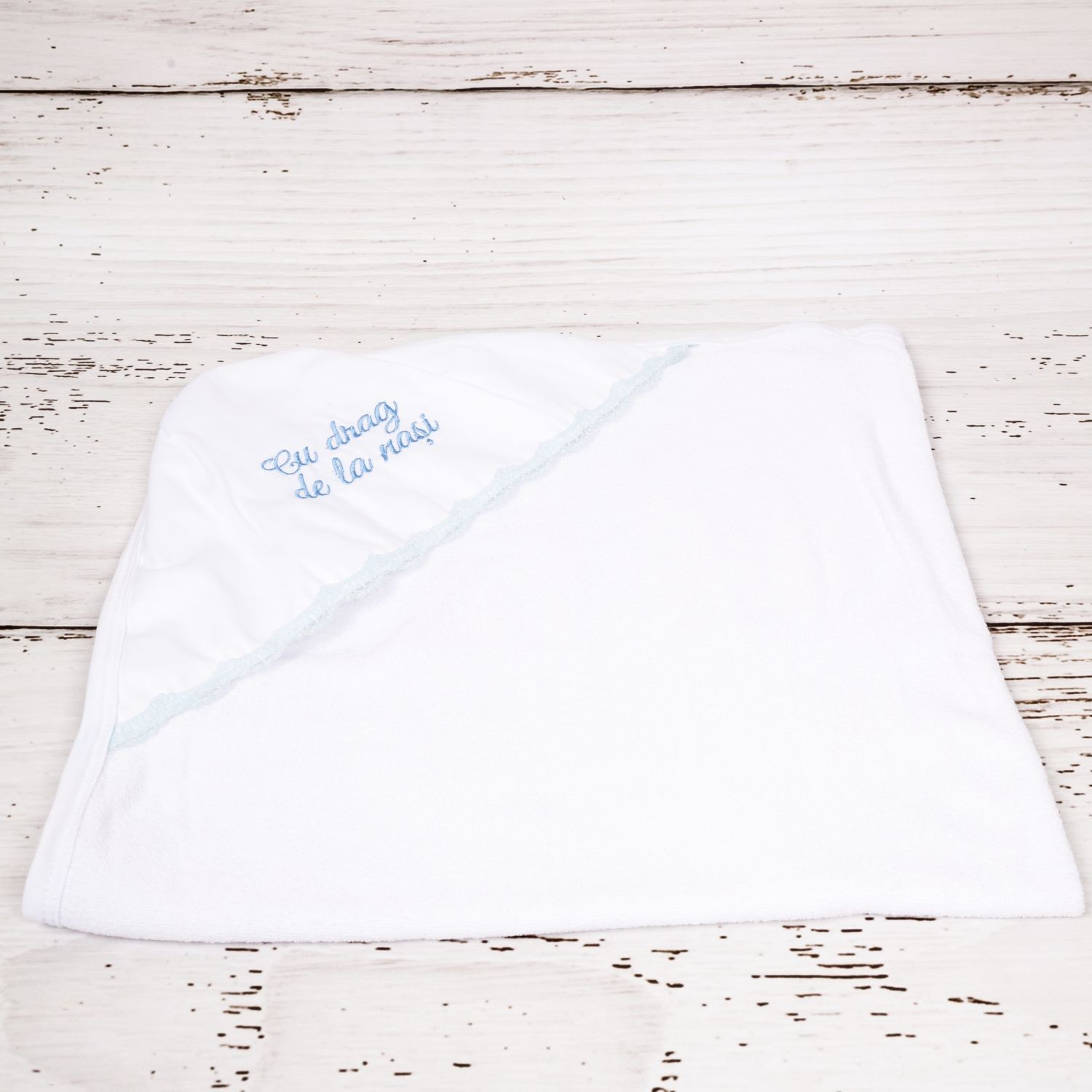 - prosop pentru bebelus cu capison, brodat cu mesajul "Cu drag de la nasi" Dimensiuni: 77 x 71 cm.