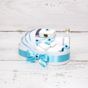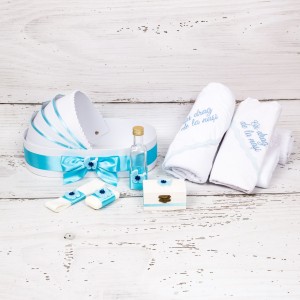 - prosop alb din bumbac si sapun pentru preot. Produsele sunt infasurate intr-o banda bleu din satin si au fundita asortata. In mod traditional, preotul se spala simbolic pe maini inainte de infaptuirea slujbei de botez. Prosopul are urmatoarele dimensiuni: 83 x 49 cm.
