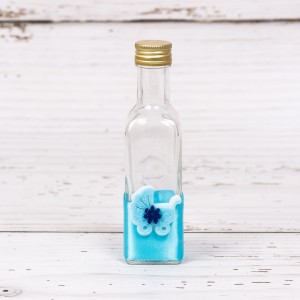 - sticluta de mir frumos decorata cu banda bleu din satin si figurina carucior fetru. Dimensiuni: 15 cm inaltime x 4 cm lungime x 4 cm latime. Capacitate 100 ml.