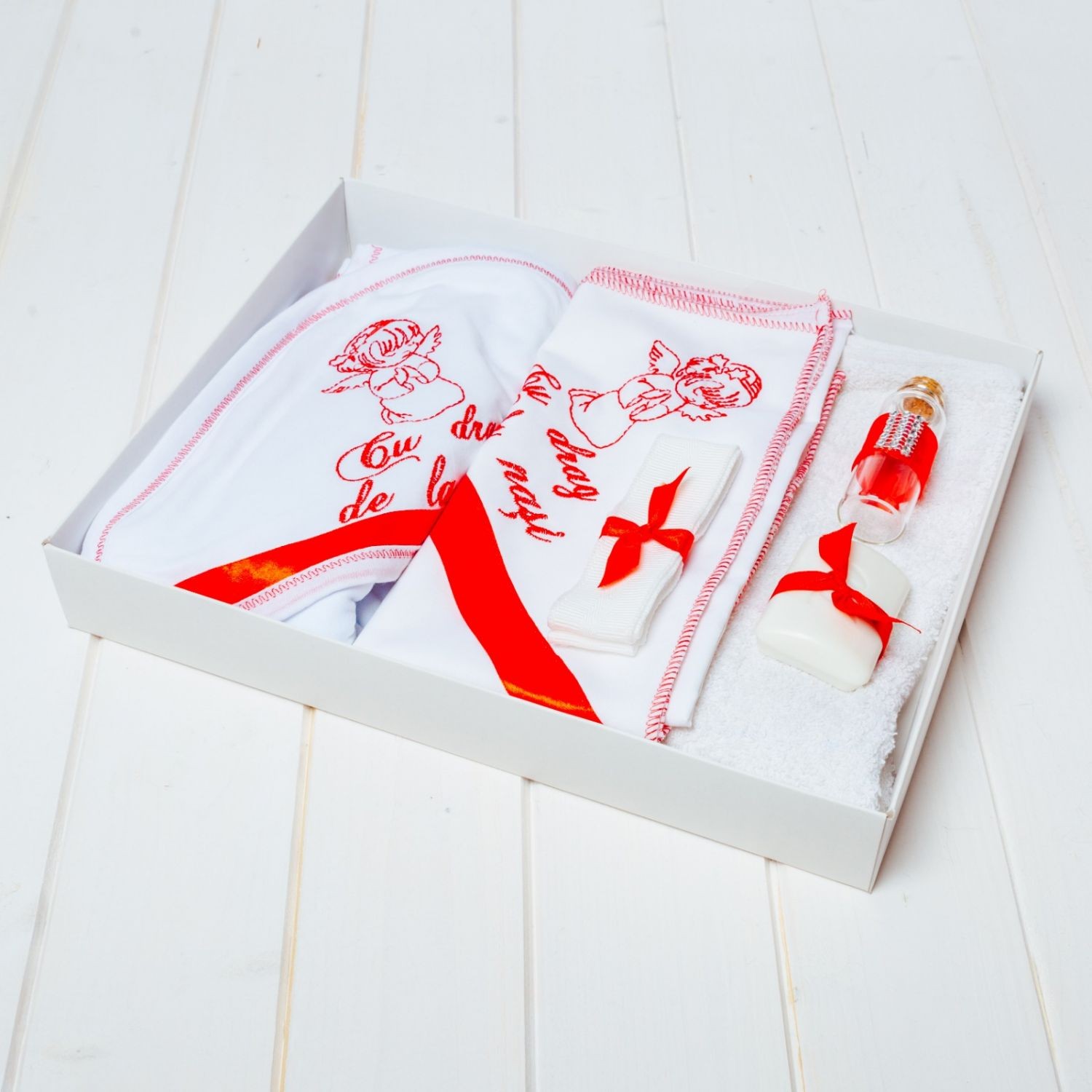 Trusoul de botez rosu cu ingeras este compus din sase lucruri esentiale.