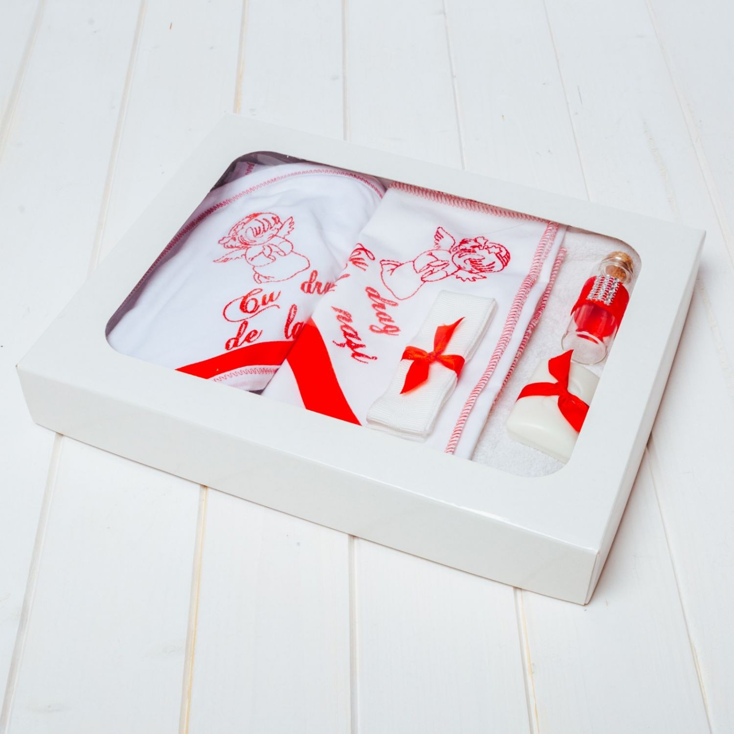 Pentru primul eveniment important din viata unei mici printese, nasa de botez poate alege un trusou botez cu ingeras in nuante de alb cu decoratiuni rosii.