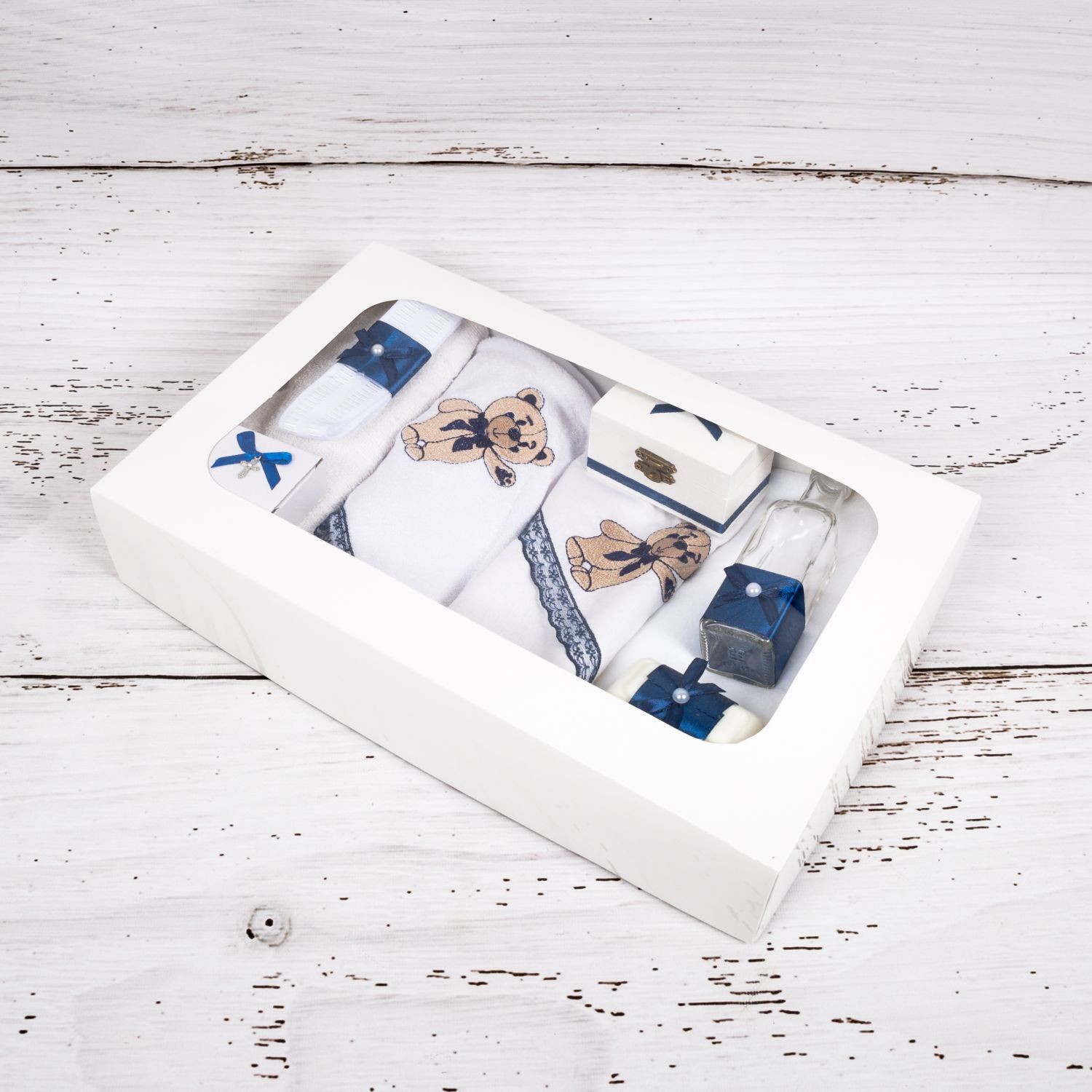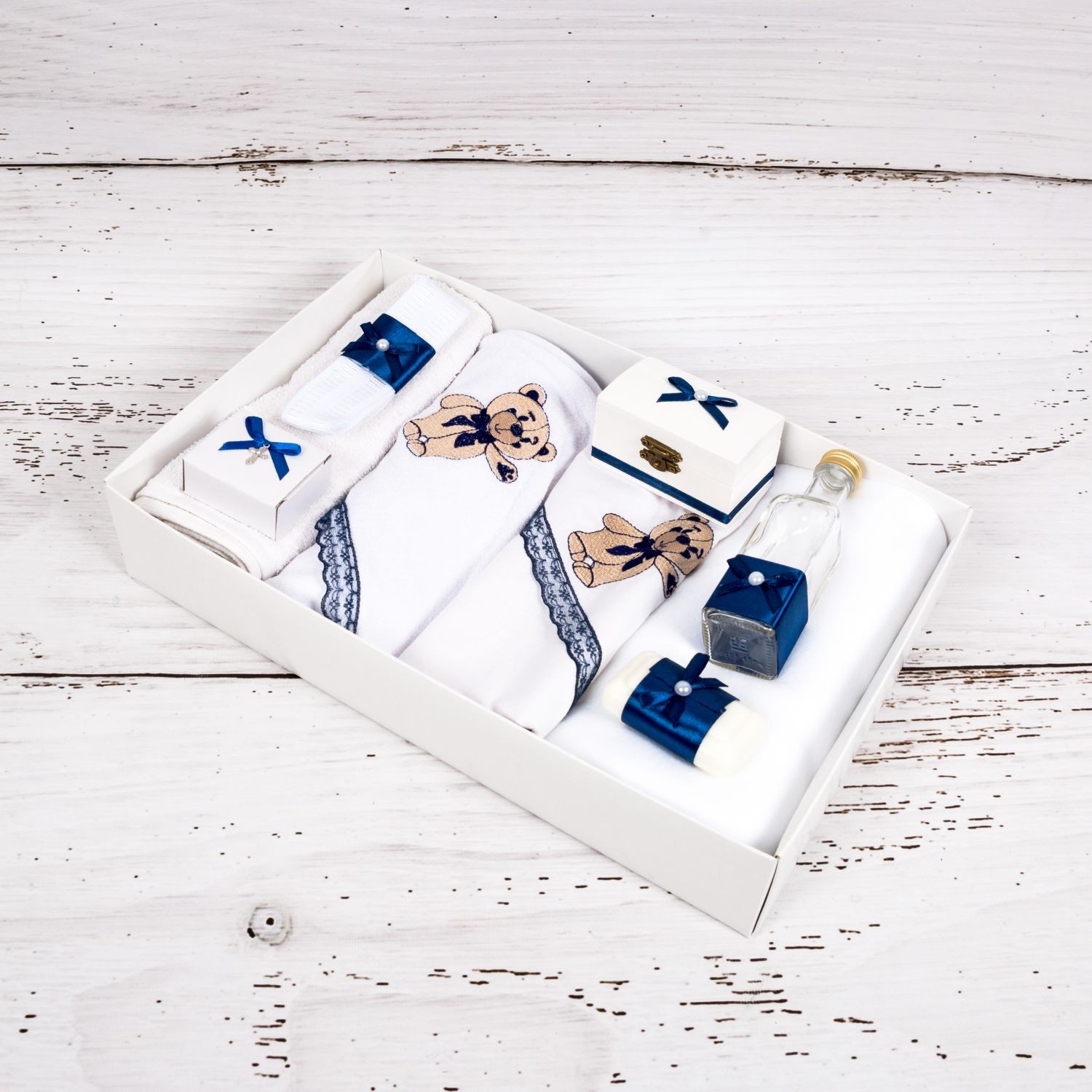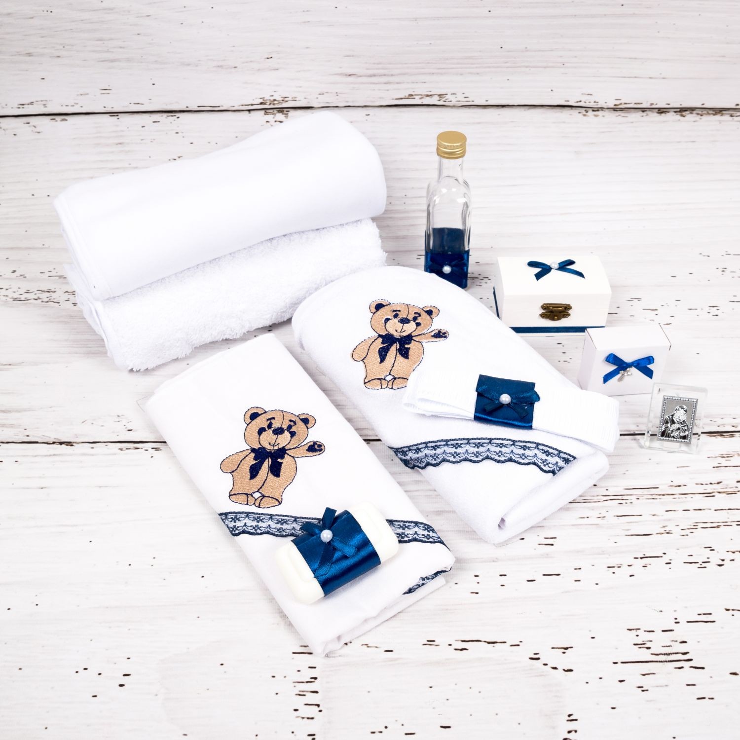 Botezul unui baietel va fi mai vesel daca nasii micutului vor alege pentru ceremonia religioasa un trusou biserica cu model bleumarin si ursuleti brodati.